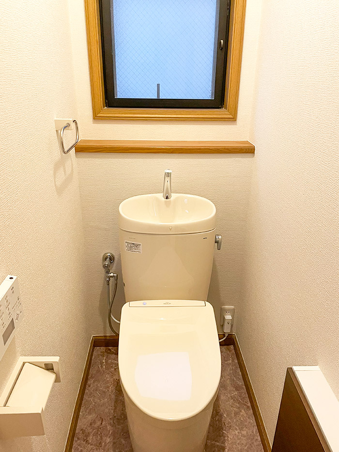 ※1階・2階ともに共通仕様 トイレ本体:TOTO ピュアレストEX ウォシュレット:TOTO アプリコットF2A クロス:サンゲツ リフォームセレクション 床材:サンゲツ Hフロア 収納:TOTO フロア収納キャビネット 埋込タイプ |