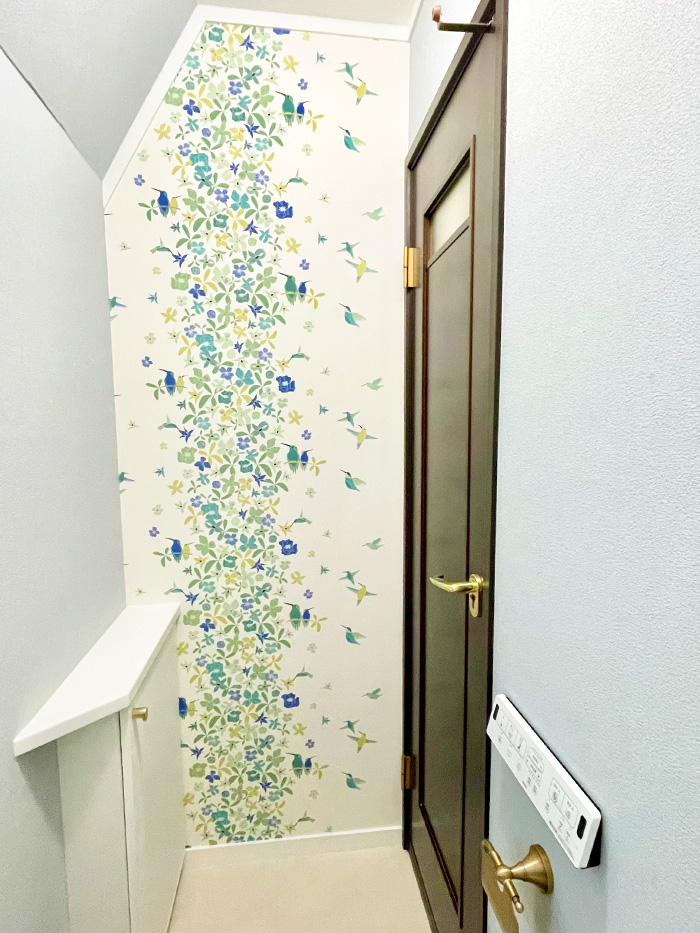 今回も内装にこだわり、トイレが可愛らしい空間になりました。工事の前に幅木や棚をお客様ご自身で塗装して頂き、新しいクロスとも綺麗に馴染んでいました。